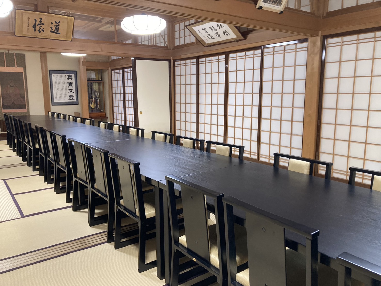 客殿に近年身体の不自由な方が多いことから座卓を変え、テーブル・椅子を導入いたしましたので、どうぞご利用ください。